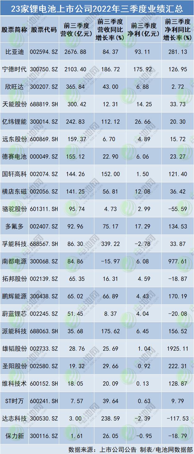 據電池網(wǎng)梳理來看,前三季(ji)度,營收方面,23家锂(li)電池上市公🏃🏻司營(ying)收總額6945.06億元,平均(jun1)營收301.96億元,其中比(bǐ)亞迪、甯德時💋代、欣(xīn)旺達、天能股份、億(yi)緯锂能、遠東股份(fèn)、德賽電池、國軒高(gāo)科、橫店東磁⛷️9家營(ying)收♍超百億,比亞迪(dí)、甯德時代營收分(fen)别達2676.88億、2103.40億;22家營收(shōu)同比正增長🈲,其中(zhōng)孚能科技、達志科(kē)技✉️、甯德時代、派能(néng)科技、國軒🈲高科、億(yì)緯锂能6家實現營(yíng)收同比翻倍增長(zhang),孚能科技營收同(tong)比增長超3倍。